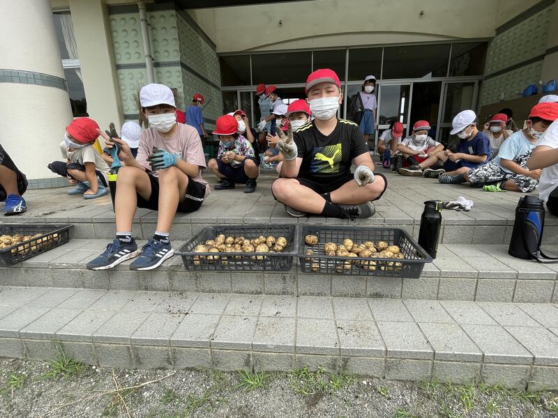 4月になかよし班(縦割り班活動)で植えたジャガイモの収穫を行いました。