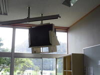 8月23日、クリーンセンターと鹿沼資源物回収事業協同組合様の協力により、ブラウン管テレビを回収していただけることになりました。それまでに、空中に設置されているテレビをおろさなければなりません。とても大きなテレビが12台!脚立を2台設置するほどの場所がない!どうおろそうか思案した挙句、校長先生が教卓を使うことを提案してくださいました。頼れる男性教員4名総動員。無事撤去作業を終えることができました。