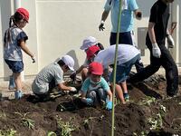 なかよし班(縦割り班)ごとに4月に植え付けをした、ジャガイモの収穫を行いました。