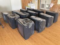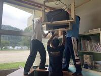 8月23日、クリーンセンターと鹿沼資源物回収事業協同組合様の協力により、ブラウン管テレビを回収していただけることになりました。それまでに、空中に設置されているテレビをおろさなければなりません。とても大きなテレビが12台!脚立を2台設置するほどの場所がない!どうおろそうか思案した挙句、校長先生が教卓を使うことを提案してくださいました。頼れる男性教員4名総動員。無事撤去作業を終えることができました。