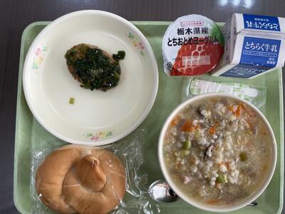 献立は、さつきの舞米粉パン、はと麦ぞうすい、ハンバーグにらソースかけ、県産とちおとめヨーグルト、牛乳です。