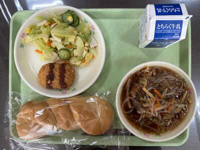 献立は、牛乳ツイストパン、牛乳、豚肉コロッケ、かまぼこサラダ、富山ブラックラーメン風スープでした。