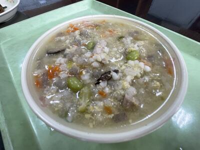 献立は、菜飯(なめし)、鶏肉の香味焼き、ごんざ、ぼっかけ汁、牛乳です。