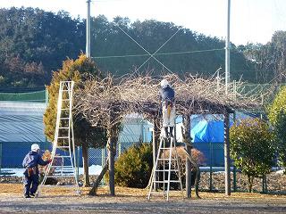 寒い時期に枝落としをすることで、春先からの成長を促すと言われいます。体育館前の松の形も整えられ一段と立派に見えます。