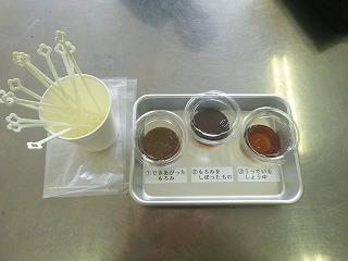 しょうゆのもとになる諸味(もろみ)が出来上がりました。目の前で諸味をしぼると生しょうゆがしたたり落ちてきました。その後、諸味、生しぼり、市販のしょうゆの味比べをしました。生しぼりがおいしかったようです。どんな料理にあうかを考えた子もいました。