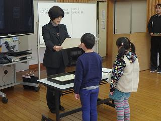 受賞伝達では理科展、標語、エコバック画のデザイン、俳句、縄跳び名人、超名人、新体力テストS認定者など、様々な面で優秀な成績を納めた子たちに表彰状を渡しました。中でも縄跳びの名人、超名人に認定された子たちは、昨年度の2倍近く増えました。表彰状を手にしなかった子も目標に向かい、自己新記録を更新した子がたくさんいました。みんなのがんばりに大きな拍手をおくりたいです。