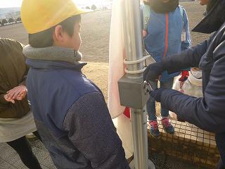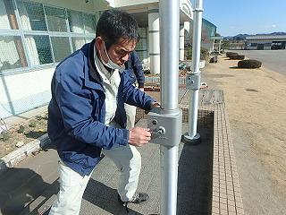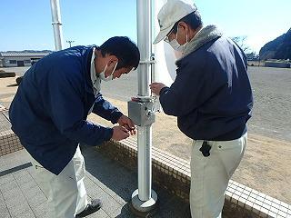 毎日使っていると、機械も劣化するのでしょうか?掲揚するときにンドルが重くなってきました。早速、市教委の作業班が来校し、メンテナンスをしてくれたので、軽く回せるようになりました。これで一安心です。ハンドルが壊れることはないでしょう。(無理矢理回してハンドルをちぎった怪力者が…もちろん子どもではありません)