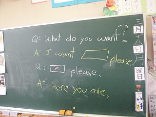 今年度、最後の授業は3・4年生がマイケル先生のお店での買い物をしました。100円=1$の計算で、お札を手に、「I want ・・・please 」大島先生や金田先生のお店も大繁盛していました。もちろん、日本語は禁止です。みんなほしい物を手に入れられたかな?