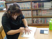 図書支援員とボランティアの方が、判を押したりカバーをかけたりと、貸し出しに向けて作業してくださいました。