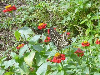 元気な子どもたちに誘われて蝶も蜜を吸いにやってきました。バッタも発見、また緑色をしていますが、稲刈りが終わる頃には茶色に変身することでしょう。