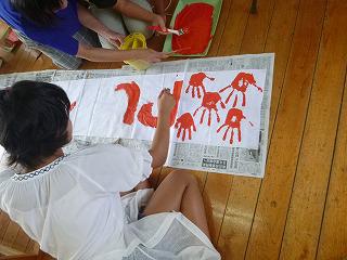 テーマカラーのオレンジ色で、手形を押し、大きくRUN伴と書き入れました。この応援旗が、たくさんの人を元気にしたり笑顔にしたりしてくれることと思います。
