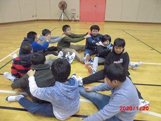 1日目最後の活動は、仲間づくりゲームでした。体育館に集まり、各学校や活動班のグループに分かれて、自己紹介や他己紹介、人間知恵の輪などのゲームをしました。寒い夜でしたが、子どもたちの楽しそうな、ホットな声が体育館一杯に響き渡っていました。