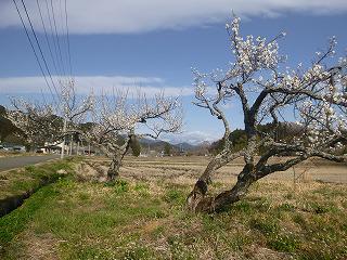 満開の白梅の奥に雪が少しだけ残った男体山と女峰山が見えます。