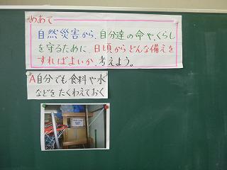 今日の授業のめあては「自然災害から自分達の命やくらしを守るために、日頃からどんな備えをすればよいか考えよう」です。先週の金曜日に事前学習をしていたので、本時は自分の考えを発表し合い、班としての意見をまとめ、発表しました。