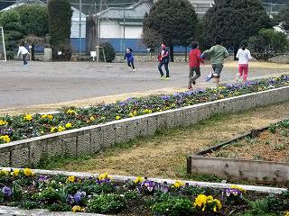 卒業式の会場づくりが終わると、外に飛び出した子どもたち。