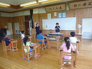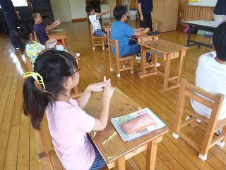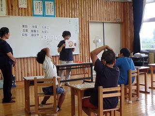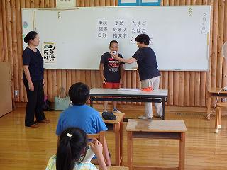 次にカードに書いてある文字を口形で伝えました。伝える子は大きく口を開けゆっくりと、答える子は口元に集中しましたが、身振りが加わるとわかりやすかったようです。
