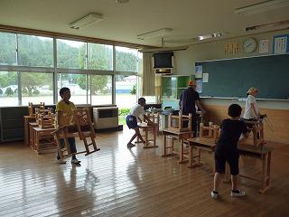 机の移動、水拭きまでは児童全員で行いました。