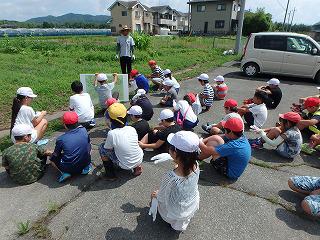最初に6年生が理科で学習した「植物のつくりとはたらき」についてジャガイモの成長の絵を示しながら説明しました。また、ジャガイモを傷つけないように深く掘ることや、道具の使い方についても注意がありました。