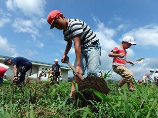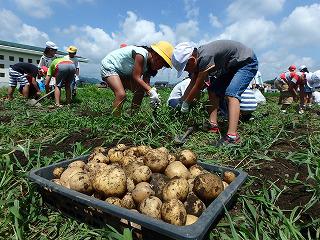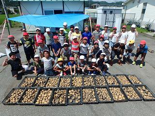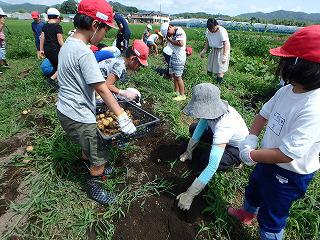 掘り始めると次々に大きいジャガイモが現れ、歓声があがりました。炎天下での作業だったので子供たちは汗だくでしたが、たくさんとれたジャガイモに満足そうでした。