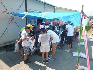 昼休みにジャガイモが分けられました。どの班も班長さんがリードして同じ量になるよう公平に分けていました。ブルーシートのテントの下で分け合う姿はまるで青空市のような賑わいでした。今晩の食卓は肉ジャガ、カレーそれともジャガバターかな?