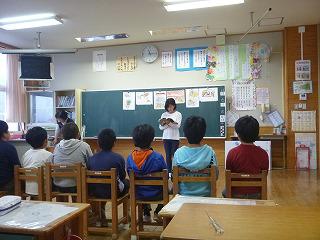 1・2年生は島村さんに「キリンですけど」と「わっしょい おじぞうさん」を、3・4年生は大牧さんに「北風と太陽」と「教室はまちがうところだ」を、5・6年生は西村さんに手塚治虫シリーズの「もえよドラゴン」を読んでもらいました。