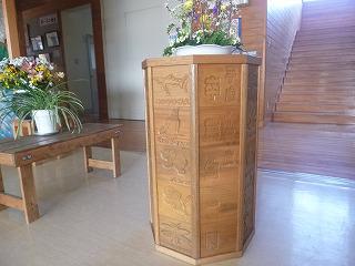 花台の木彫は平成10年度の卒業制作です。鳥や魚などが丁寧に彫られています。