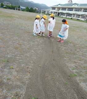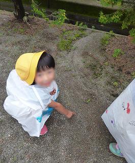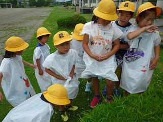 みんなで、かっぱを着て、黄色い帽子をかぶって、校庭を探検しました。