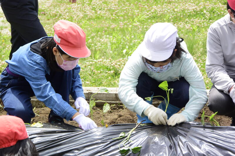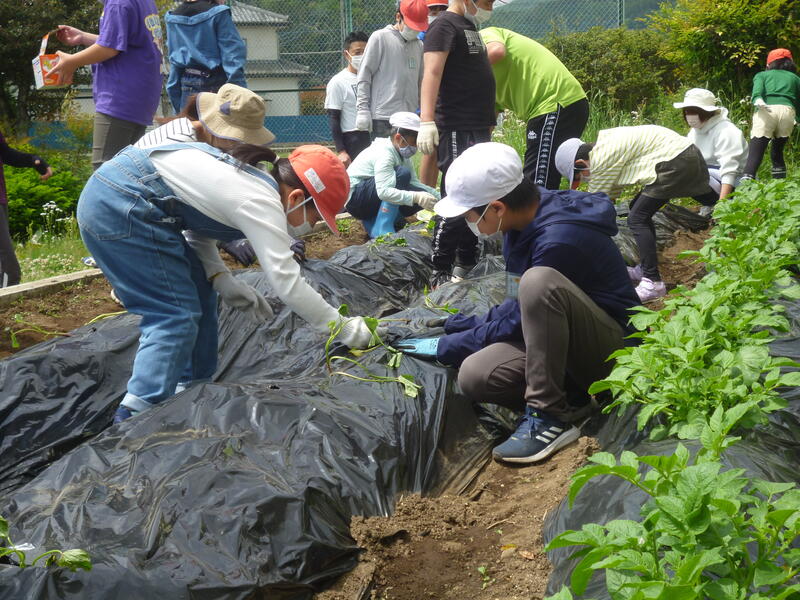先月のジャガイモの種芋植えとは勝手が違い少し苦労していましたが、上級生の手伝いで植えることができました。