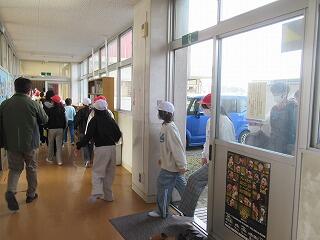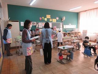 粟野地区学校給食共同調理場の場長、学校栄養教諭、栄養士の皆様が来校され、学校給食に関する訪問を実施しました。配膳室の状況や各学級の配膳、喫食の様子をご覧になりました。