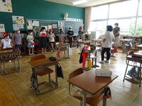 最初に、各班ごとに集まって、班長が進め方のポイントや分担の説明をしました。その後、分かれて、上学年が中心となり、安全上、衛生上問題はないか、様々な箇所を実際に触って点検しながら、分担場所をしっかり点検していました。下学年の児童も、頑張っている上学年の姿を見て、まねをしながら点検している姿が見られました。点検後は、各班ごとに振り返りをしました。