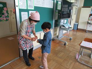 感染症対応のため、職員が配膳台の消毒や給食当番の健康チェック、手洗い後の手指の消毒液配布などを行っています。
