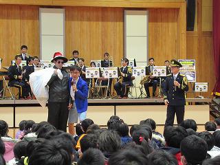 演奏は、「マーチ ブルースカイ」で始まり、「山の音楽家」に合わせて、演奏に使用している楽器の紹介もしてくださいました。その他に、みんなのよく知っている「パプリカ」や「銀河鉄道999」等の演奏もありました。途中、防犯標語「いかのおすし」を取り入れた交通安全の寸劇もありました。交通ルールや「いかのおすし」について楽しく学べました。また、児童が指揮を体験させてもらう場面もありました。
