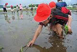 毎年恒例の田植えが行われました.泥に足を取られて上手く歩けなくなってしまった子、尻もちをついてしまった子等、皆、泥と楽しく格闘しながら約6アールの学校水田に苗を植えることができました。田植えの準備や、開閉会式を担当したのは5年生です。高学年としての初めての大仕事を一生懸命進める姿が見られました。