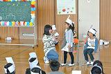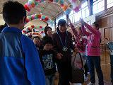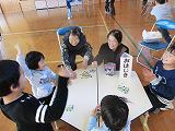 全校児童でのゲームでは、フルーツバスケットを行いました。頭にフルーツの面をつけ、先生方も一緒に楽しみました。鬼になった人は自己紹介をしたのですが、一人一人が自分の好きな食べ物や誕生日などを伝えることがでました。とても和やかなゲームとなりました。