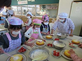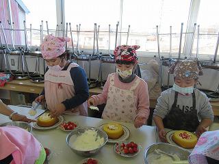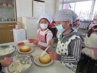 丸いスポンジケーキの真ん中に、細かくカットされたいちごをたっぷり入れて、生クリームを塗りました。最後に、生クリームを塗ったケーキの上に、まっ赤ないちごをきれいに飾りました。生クリームを塗るのに苦戦していた児童もいましたが、ボランティアのみなさんにアドバイスしていただきながら、全員、上手に生クリームを塗ることができました。