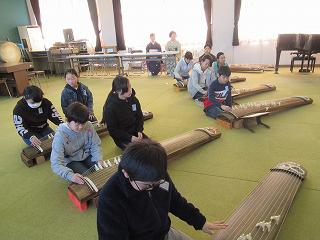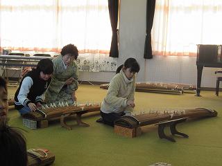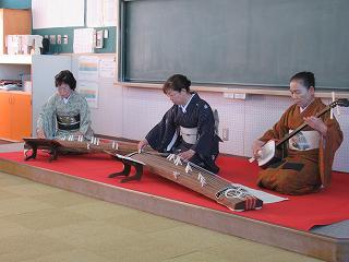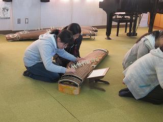 クイズ形式で箏や三味線の作りについて学んだ後、講師の先生方による『金剛石』と『六段』の演奏があり、音楽室に邦楽の音色が響きわたり、和の世界に包まれました。