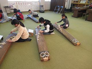 最初に、学年ごとに6面の箏(こと)を使って「さくらさくら」の演奏を体験しました。