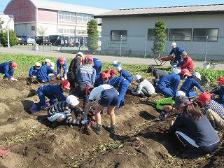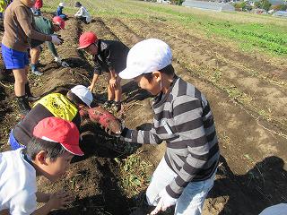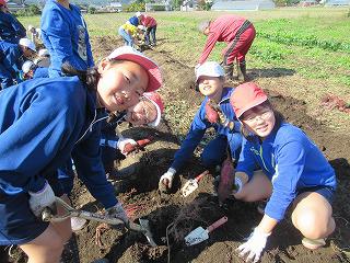 「直立植え」をしたせいか、地中深いところにサツマイモができていたので、想像していた以上に掘るのに手間取ってしまい、児童全員の力を結集し、苦労の末、サツマイモを掘り終わりました。苦労した分、農作業の大変さを実感し、収穫の喜びを感じられたのではないでしょうか。