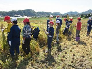 縦割りのなかよし班ごとに各班の中でペアを組んで活動しましたが、上級生が下級生の面倒を優しく見てあげながら、みんなで熱心に活動していました。稲刈りが初めての1年生も、上級生に上手に刈り方を教えてもらったおかげで、安全に鎌を扱いながら、どんどん刈っていくことができました。また、取り残した稲を1本も残さないように大切に拾い集めている姿も、あちらこちらで見られました。
