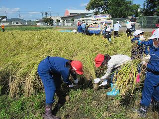 5月に全校児童で田んぼに植えた稲が実り、9月19日(水)に稲刈りを行いました。稲刈りには、PTA三役の皆様や事業部長の早乙女様を始め、事業部の皆様がお手伝いに来てくださり、子供たちの活動を力強く支えてくださいました。