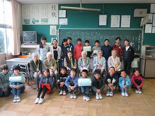 2年、5年、6年の子供たちにより「雑巾贈呈の集い」を催して、高齢者の皆さんと温かくふれあう時間を過ごしました。高齢者の皆さんから雑巾を受け取り、子供たちからは感謝の言葉をお返しすると共に、折り紙でつくったお礼のメダルと肩もみもして、感謝の気持ちを伝えました。