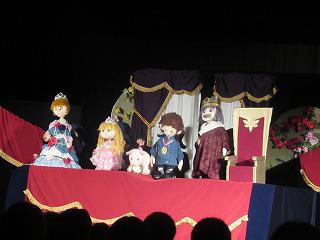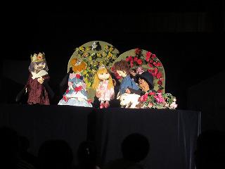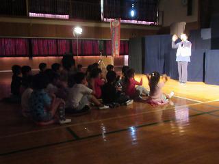 次に、手遊びを楽しんだ後、「かしこいブタとお姫さま」の人形劇を鑑賞しました。わがままなお姫さまが、かしこいブタと一緒に過ごすうちに優しいお姫さまに変わっていくお話です。巧みな人形操作に加えて、照明やBGMが大変工夫されていて、子供たちも物語の中に引き込まれて、人形劇を楽しんでいました。