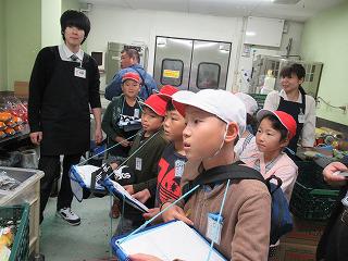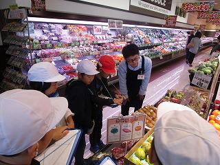 次に、店内に配列した商品について説明をいただきました。どのスーパーマーケットでも、店の入口を入ると、まず野菜や果物が並べられているそうです。ヤオハン粟野店には、柿やブドウなど、旬のものが最初に目に入るように配列されていました。ヤオハン粟野店長の見目さんから3年生の子供たちに、「なぜ、最初に野菜や果物が置かれているのでしょうか。」と宿題が出されました。社会科の時間にみんなで話し合いたいと思います。御家庭でも、是非、話題にしてみてください。