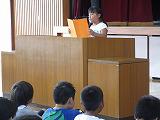 『始業式』では、各学級から代表として選ばれた5人の児童が、全校児童の前で、「2学期に頑張りたいこと」や「夏休みに楽しかったこと」を発表しました。4・5年生と6年生の代表児童は、原稿なしにみんなの顔を見ながら発表を行うことができ、上級生としての立派な姿を見せてくれました。1~3年生の代表児童の言葉も、一生懸命に頑張りたいという、強い気持ちを感じることができる発表でした。