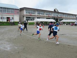 お昼頃より天候が回復し始め、保護者の方々が率先してグラウンドの水取りなどをしてくださるなど、多くの方々が昼食の時間を割いて御協力くださったお陰で、グランドの復旧もできたため、午後は、校庭で、リレーや障害走などの競技を行いました。午前中に体育館で行ったダンスを、もう一度校庭でも見たい等のリクエストをお客様よりいただき、下学年、上学年分かれてダンスを披露することにしたのですが、自然と児童全員が校庭に出てきて、皆で楽しく笑顔いっぱいにダンスを踊る姿が見られました。