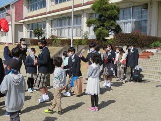 卒業式の後は、校庭で、在校生や保護者、職員が作る花道を通り、送り出されました。規模を縮小しての卒業式でしたが、心温まる卒業式が行えました。