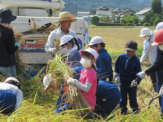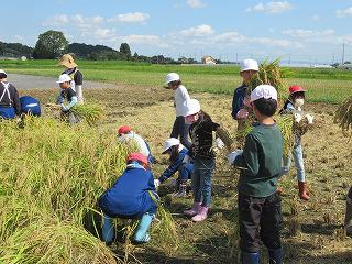 当日は、なかよし班ごとに上級生と下級生がペアになって、稲を刈る仕事と、刈った稲を運ぶ仕事を交代しながら行いました。今年は、天候不順による稲の生育が心配されましたが、PTA事業部長の早乙女様をはじめ、多くのPTAの皆さんの御協力、御支援によって、今年もたくさんのお米がとれました。