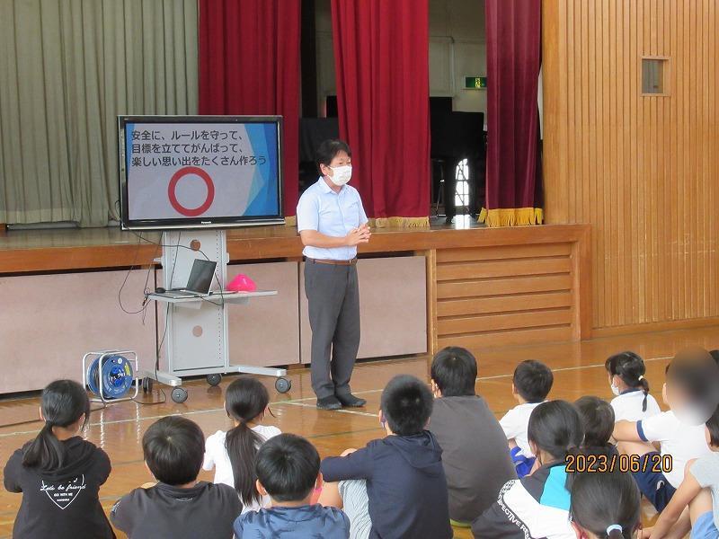 6/20(火)いきいきタイムに体育館に集まり全学年で「プール開き」を行いました。プールの正しい使い方やマナーについてクイズ形式で学びました。7月からの水泳が楽しみです。