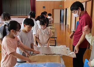 10月2日(月)洪水が発生した時の避難訓練を行いました。避難場所である体育館に避難した後、避難用具を見学しました。本校は、地域の避難場所になっており、避難してきた人たちが、数日間生活できることが分かりました。