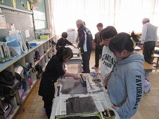 今回は、版画制作の仕上げとなる「刷りの工程」について、技術的な面を丁寧に教えていただきました。子供たちは、刷り上がった作品を見て、その仕上がりに大変満足している様子でした。一つひとつの作業を真剣に進め、作品を完成させる喜びを感じられたようです。